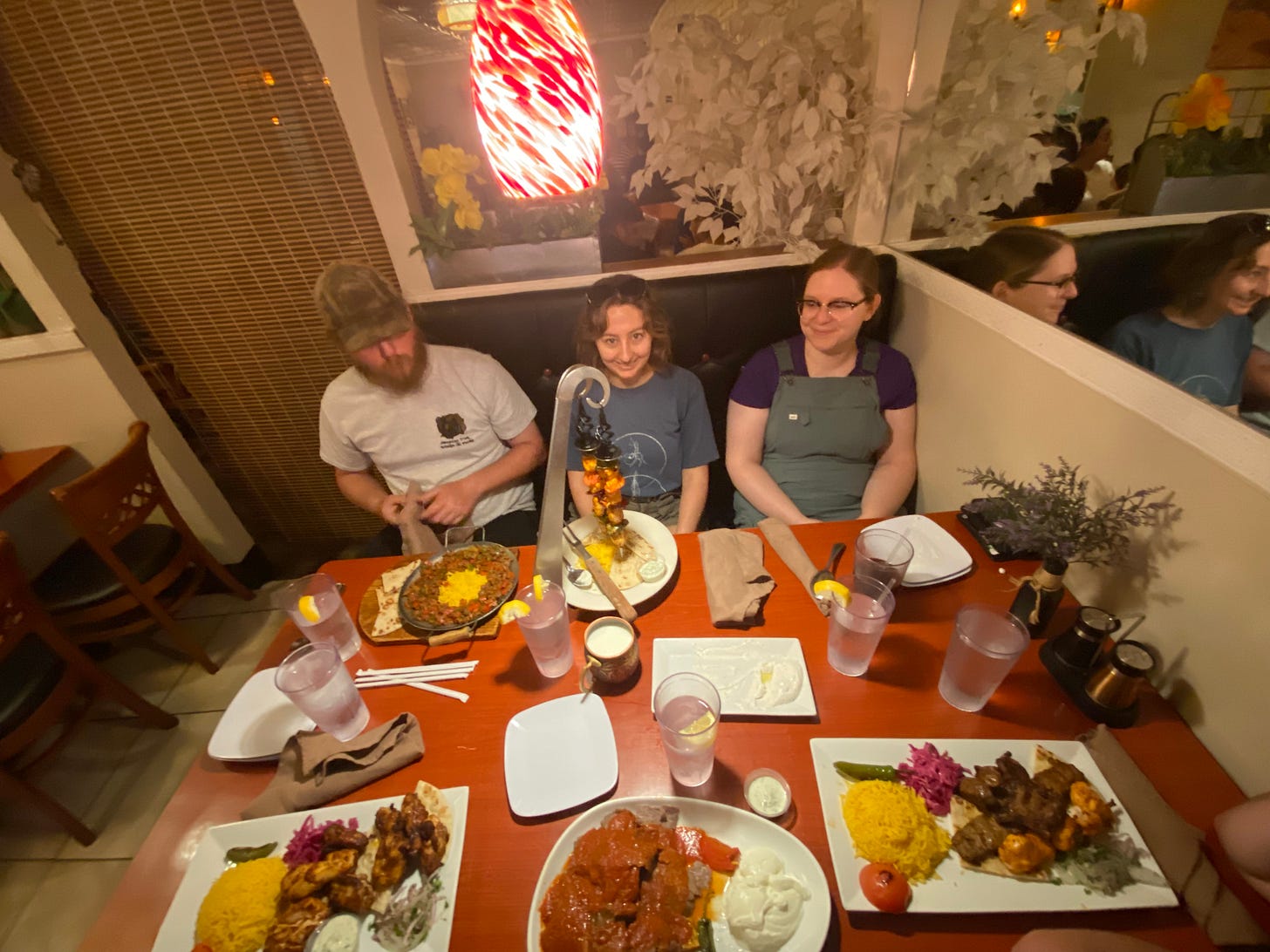 With that, the rain started to roll back in, and we hurriedly left the zoo. We stopped at a local Mediterranean restaurant and ate happily as we laughed about the day’s adventures. Look how happy everyone is!